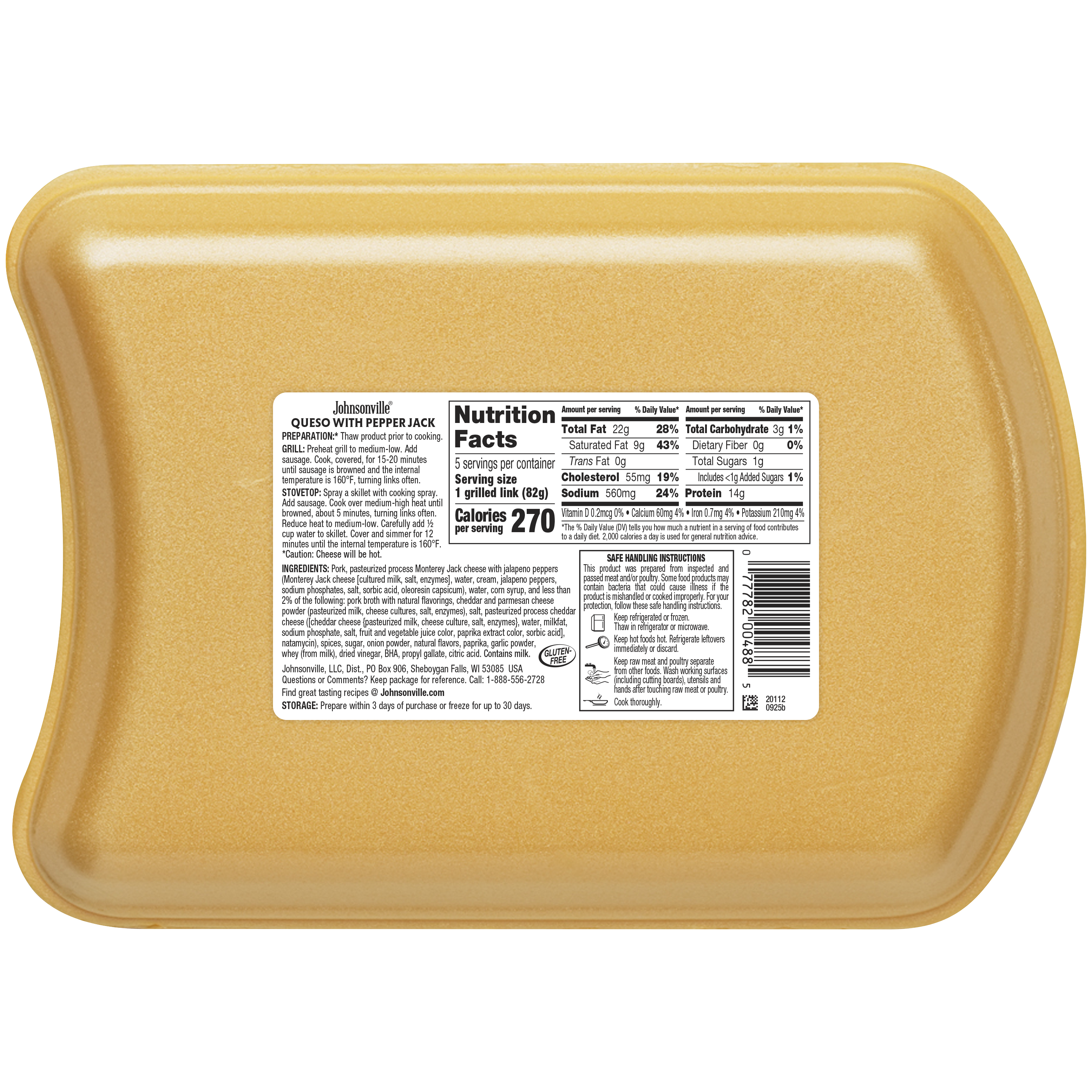 Ingredients: Pork, pasteurized process Monterey Jack cheese with jalapeno peppers ([Monterey Jack cheese (cultured milk, salt, enzymes), water, cream, jalapeno peppers, sodium phosphates, salt, sorbic acid, oleoresin capsicum], powdered cellulose), water, corn syrup, and less than 2% of the following: cheddar and parmesan cheese powder (pasteurized milk, cheese cultures, salt, enzymes), pork broth with natural flavorings, salt, pasteurized process cheddar cheese ([cheddar cheese {pasteurized milk, cheese culture, salt, enzymes}, water, milkfat, sodium phosphate, salt, fruit and vegetable juice color, paprika extract color, sorbic acid], potato starch and powdered cellulose, natamycin), spices, sugar, onion powder, natural flavors, paprika, garlic powder, whey (from milk), BHA, propyl gallate, citric acid. Contains milk.